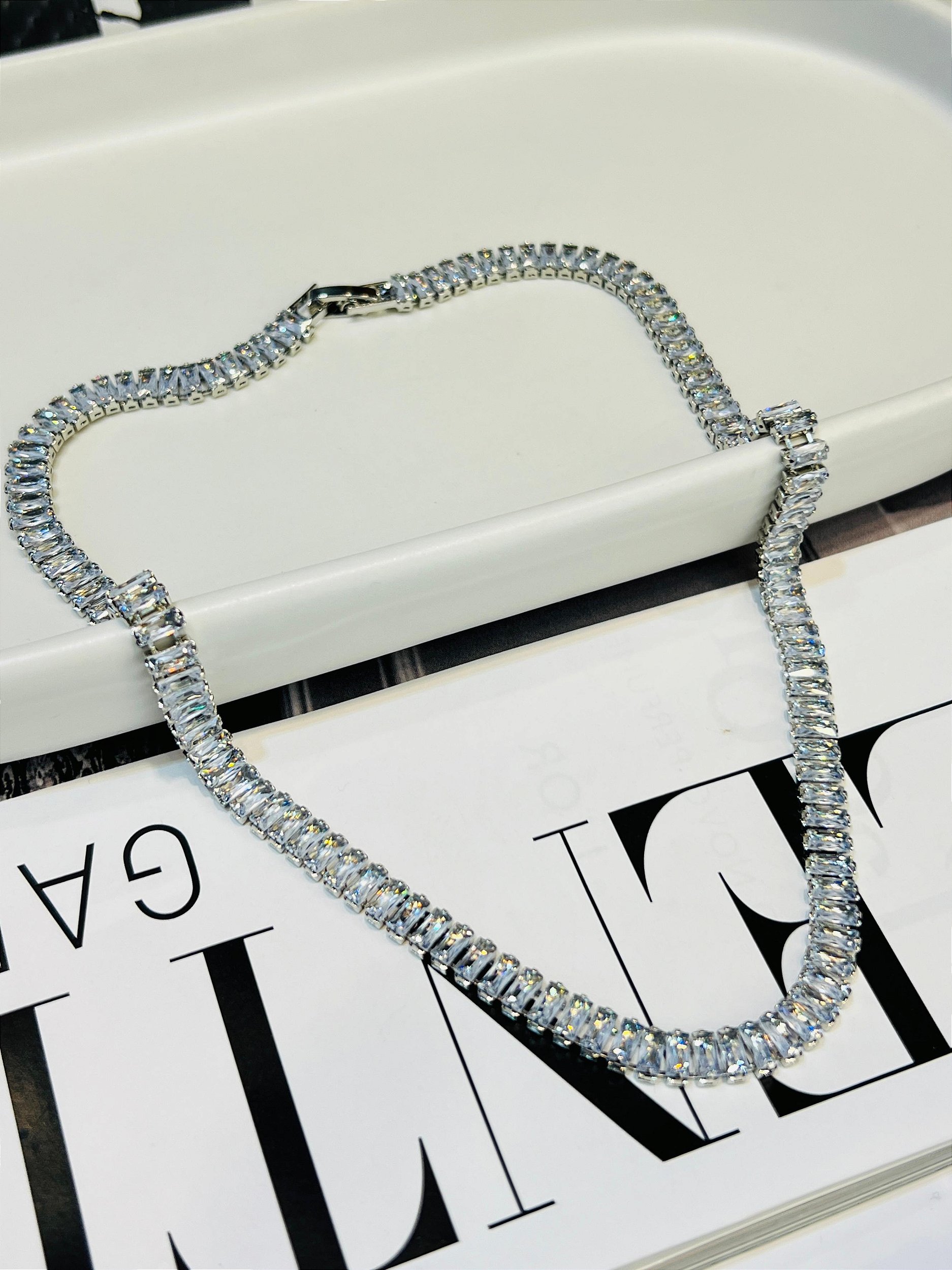Inspiração da mais alta joalheria, o colar Riviera Baguete é uma peça cravejada com zircônias douradas e cristais, que transmite elegância, sofisticação e muito estilo. Confeccionado em metal de alta qualidade, recebe banho de 1 milésimo de ouro e dupla camada de verniz nacional e no prata banho em ródio, garantindo maior durabilidade, brilho e acabamento premium. Possui 40 cm de comprimento, sendo ideal para quem busca um acessório refinado, atemporal e versátil. O colar é antialérgico, livre de níquel e conta com fecho tipo joia, que proporciona segurança e praticidade no uso.