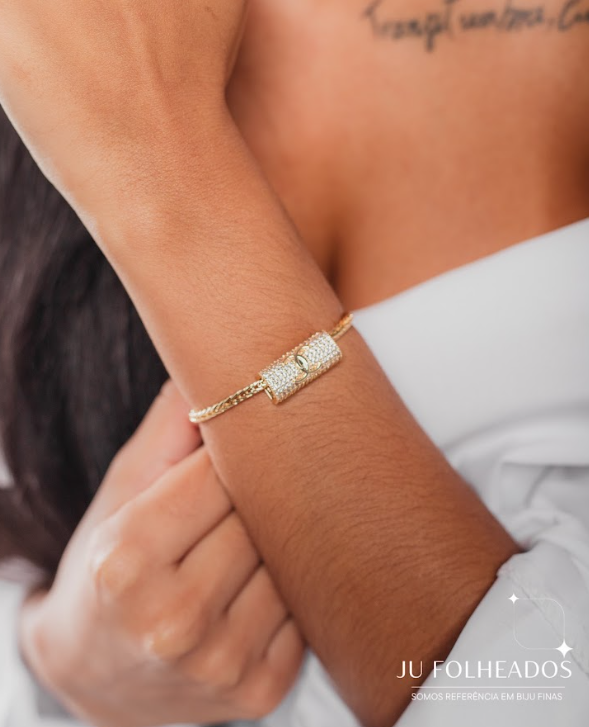 A pulseira CN é uma peça delicada, elegante e sofisticada, cravejada com cristais que refletem beleza e sofisticação em cada detalhe. Confeccionada em metal de alta qualidade, folheada com 1 milésimo de ouro e camada de verniz nacional, garante resistência, durabilidade e acabamento premium. Possui 16 cm de comprimento, fora o extensor, proporcionando ajuste confortável e seguro. Assim como o colar, a pulseira é antialérgica, livre de níquel e conta com fecho tipo joia, que proporciona segurança e praticidade no uso.